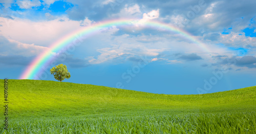 © muratart, Naklejka premium Beautiful landscape with green grass field and lone tree in the background amazing rainbow