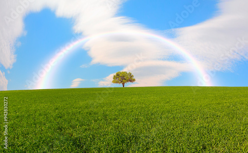 © muratart, Naklejka premium Beautiful landscape with green grass field and lone tree in the background amazing rainbow