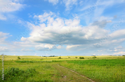 © Viktoriia Kolosova, Fototapeta premium beautiful landscape with green meadows and blue sky