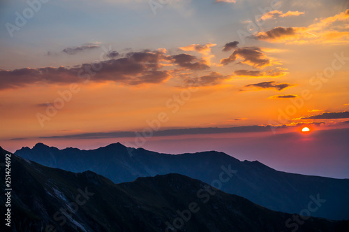 © Gabriel Teleptean, Fototapeta premium Beautiful landscape with high mountains , blue sky and yellow sunlight in sunrise.