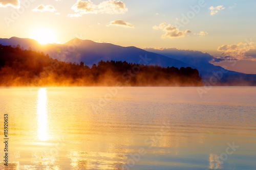 © jozefklopacka, Naklejka premium beautiful landscape with mountains and lake at dawn in golden, blue and purple tones.