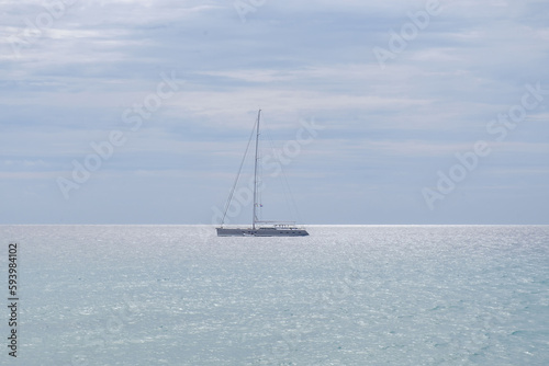 © Elena Krivorotova, Naklejka premium Beautiful landscape with sailboat in the ocean on the Canary Island Fuerteventura, Spain.