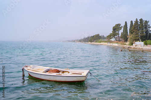 © luengo_ua, Naklejka premium Beautiful landscape with seashore and fishing boat.