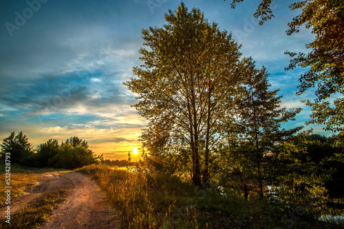 Fototapeta premium Beautiful landscape with sun and forest and meadow with road at sunrise.