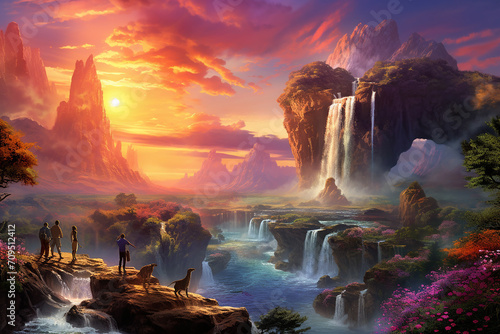 © Jacek, Fototapeta premium Beautiful landscape with sunset and waterfalls, surrounded by cherry blossom trees near Japan