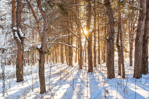 Fototapeta premium Beautiful landscape with sunset rays of the sun through the winter snow forest with