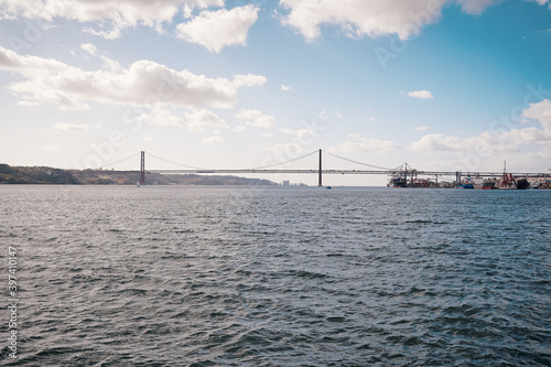 Naklejka premium Beautiful landscape with suspension 25 April bridge bridge over the Tagus river in Lisbon, Portugal.