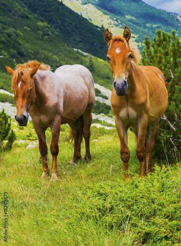 Fototapeta premium Beautiful landscape with wild horses in the mountain
