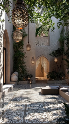 Obraz premium Beautiful lantern lit courtyard with lush vegetation and patterned floor