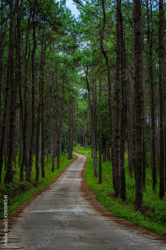 © Thinapob, Naklejka premium Beautiful larch forest with different trees,pine forest green on the mountain on nature trail at Doi Bo Luang Forest Park, Chiang Mai, Thailand in the morning.