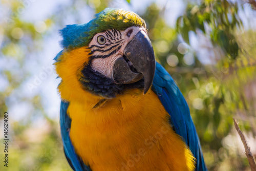 Obraz premium Beautiful large colorful macaw parrot in a large garden
