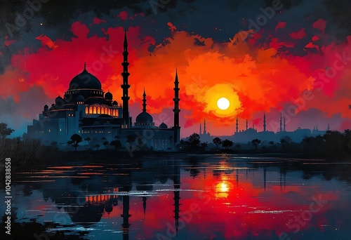 © Layla, Fototapeta premium Beautiful large Islamic mosque at the sunset sky background