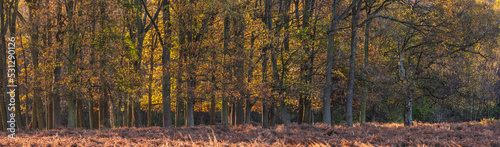 Fototapeta premium Beautiful large panorama Autumn Fall landscape image of backlit forest during...
