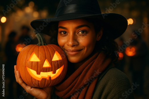 © natalia, Fototapeta premium Beautiful Latina Woman in a Hat Holding a Spooky Pumpkin - Smiling Woman with a Jack-O'-Lantern at a Halloween Part