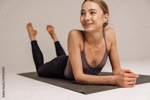 © Drobot Dean, Fototapeta premium Beautiful laughing sportswoman resting while working out on mat