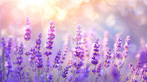 Naklejka premium Beautiful lavender field at sunrise. Purple flower background. Blossom violet...