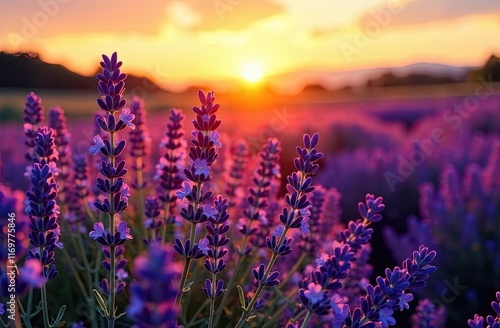 Fototapeta premium Beautiful lavender field at sunset with vibrant colors in the sky