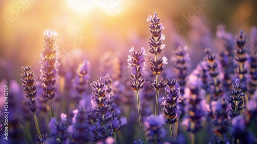 Fototapeta premium Beautiful lavender field in sunlight. The vibrant purple flowers create a...