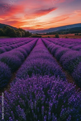 Obraz premium Beautiful lavender fields under a colorful sunset in rural France during...