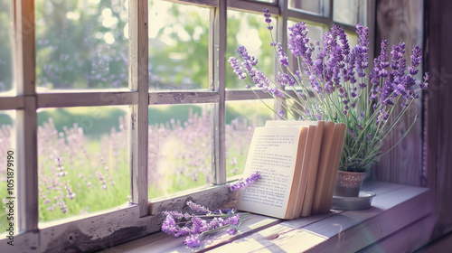 © rattana, Fototapeta premium Beautiful lavender flowers and book on window sill indoors