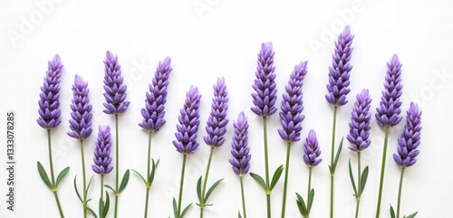 Naklejka premium Beautiful lavender flowers arranged on a white background, perfect for wellness, aromatherapy, or floral design themes.