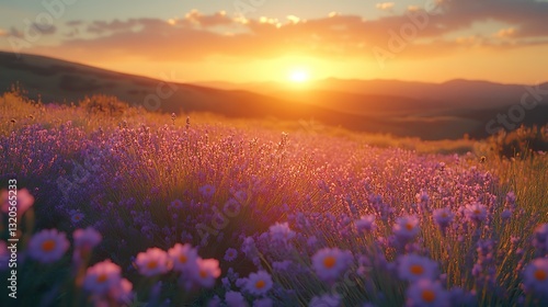 © Sang, Fototapeta premium Beautiful lavender flowers bloom on a hillside in the warm sunset glow, creating a picturesque landscape of color and tranquility.