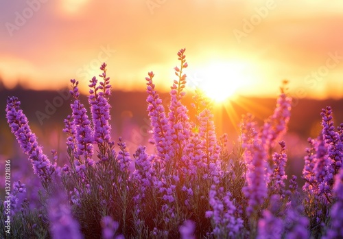 Fototapeta premium Beautiful lavender flowers blooming at sunset with warm sun rays shining through and creating a serene atmosphere in a natural landscape