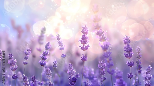 Naklejka premium Beautiful lavender flowers blooming in a field at sunset. Concept of aromatherapy, relaxation, nature, and beauty.