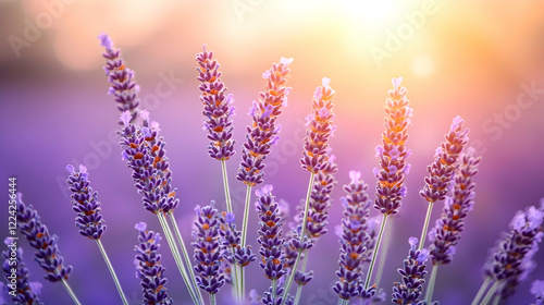 Naklejka premium Beautiful Lavender Flowers Blooming in Golden Sunset Light