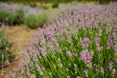 © New Africa, Naklejka premium Beautiful lavender flowers growing in field, closeup
