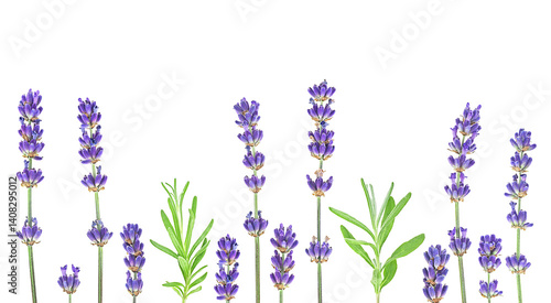 © domnitsky, Naklejka premium Beautiful lavender flowers mix isolated on a white background. Branches and green leaves of lavender. Aromatic flowers.
