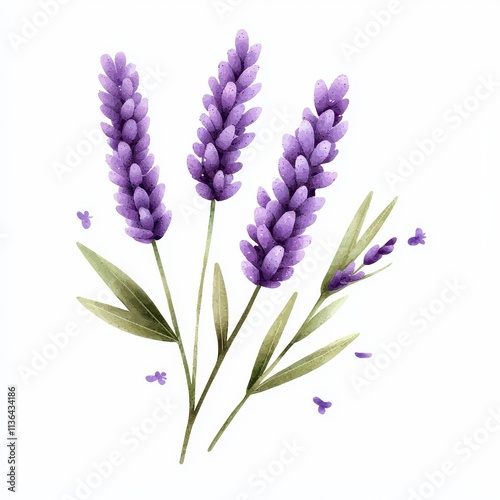Fototapeta premium Beautiful lavender flowers with green leaves on a clean white background.