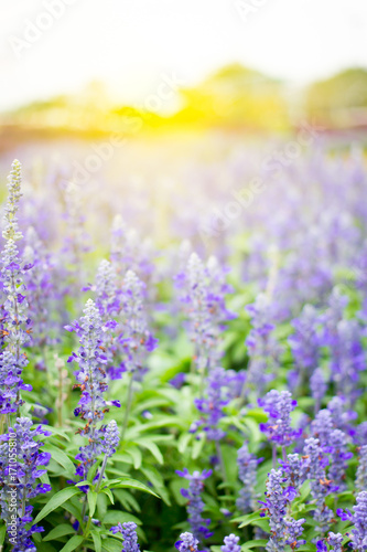Fototapeta premium Beautiful lavenders close up in the garden with blurred larvender field...