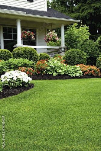 Naklejka premium Beautiful lawn and flowerbeds adorn front of home for summer sale advertising