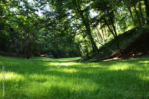 © New Africa, Fototapeta premium Beautiful lawn with fresh green grass among trees on sunny day, low angle view