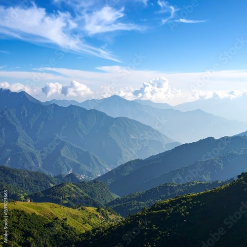 © sam, Naklejka premium Beautiful layered mountains under a blue sky