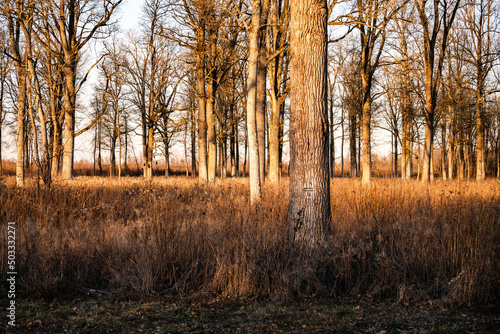 Fototapeta premium Beautiful, leafless forest and dry grass growing beneath the trees in the Turopoljski Lug, Croatia, lit by wonderful winter sunset