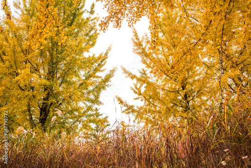 © Chongbum Thomas Park, Obraz premium Beautiful leave and tree in a park,yellow,orange, green, red colors and autumn landscape.