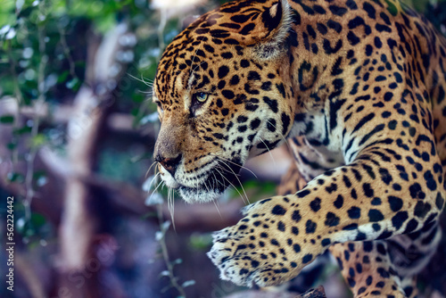 Naklejka premium Beautiful leopard close-up portrait, Panthera pardus, over green background