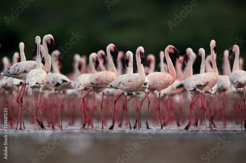 © Dr Ajay Kumar Singh, Fototapeta premium Beautiful Lesser Flamingos, an eye level shot, Bogoria lake