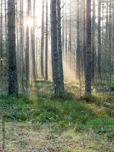 © Martins Vanags, Obraz premium beautiful light beams in forest through trees