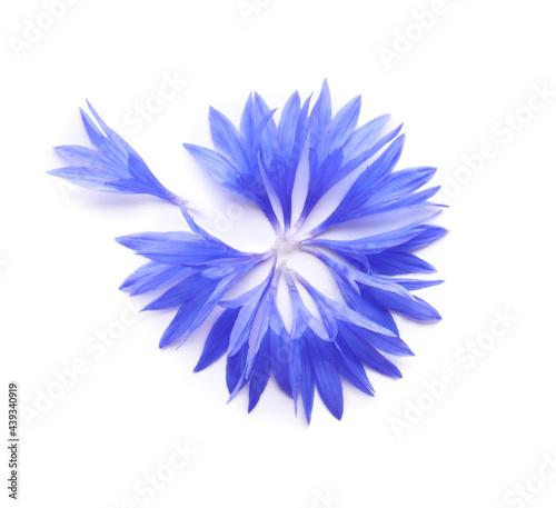 © New Africa, Fototapeta premium Beautiful light blue cornflower petals on white background, top view