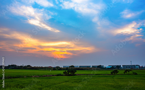 © Nueng, Obraz premium Beautiful light of Sunset with clouds in the sky reflection behind the building and paddy fields.