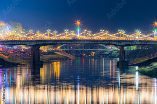 Fototapeta premium Beautiful light on the Nan River at night on the bridge (Naresuan Bridge) on the Road in Realm for Naresuan the Great Festival and Red Cross Annual event in Phitsanulok,Thailand.