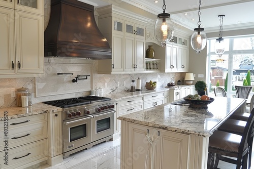 © MeyKitchen, Fototapeta premium beautiful light white kitchen with golden details and granite countertop