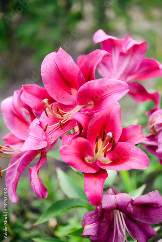 Fototapeta premium Beautiful lily flower on a background of green leaves. Lily flowers in the garden. Background texture with burgundy buds. Image of a flowering plant with crimson flowers of a varietal lily.