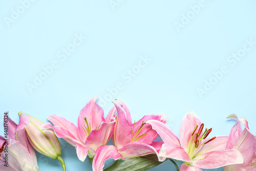 Fototapeta premium Beautiful lily flowers on blue background