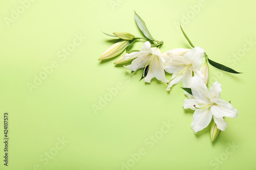 © Pixel-Shot, Fototapeta premium Beautiful lily flowers on color background