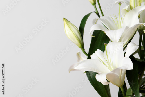Fototapeta premium Beautiful lily flowers on white background, closeup. Space for text