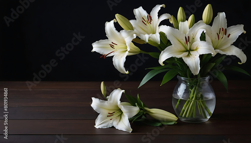 © Alfranto, Fototapeta premium Beautiful lily on dark background with space for text. Funeral flower